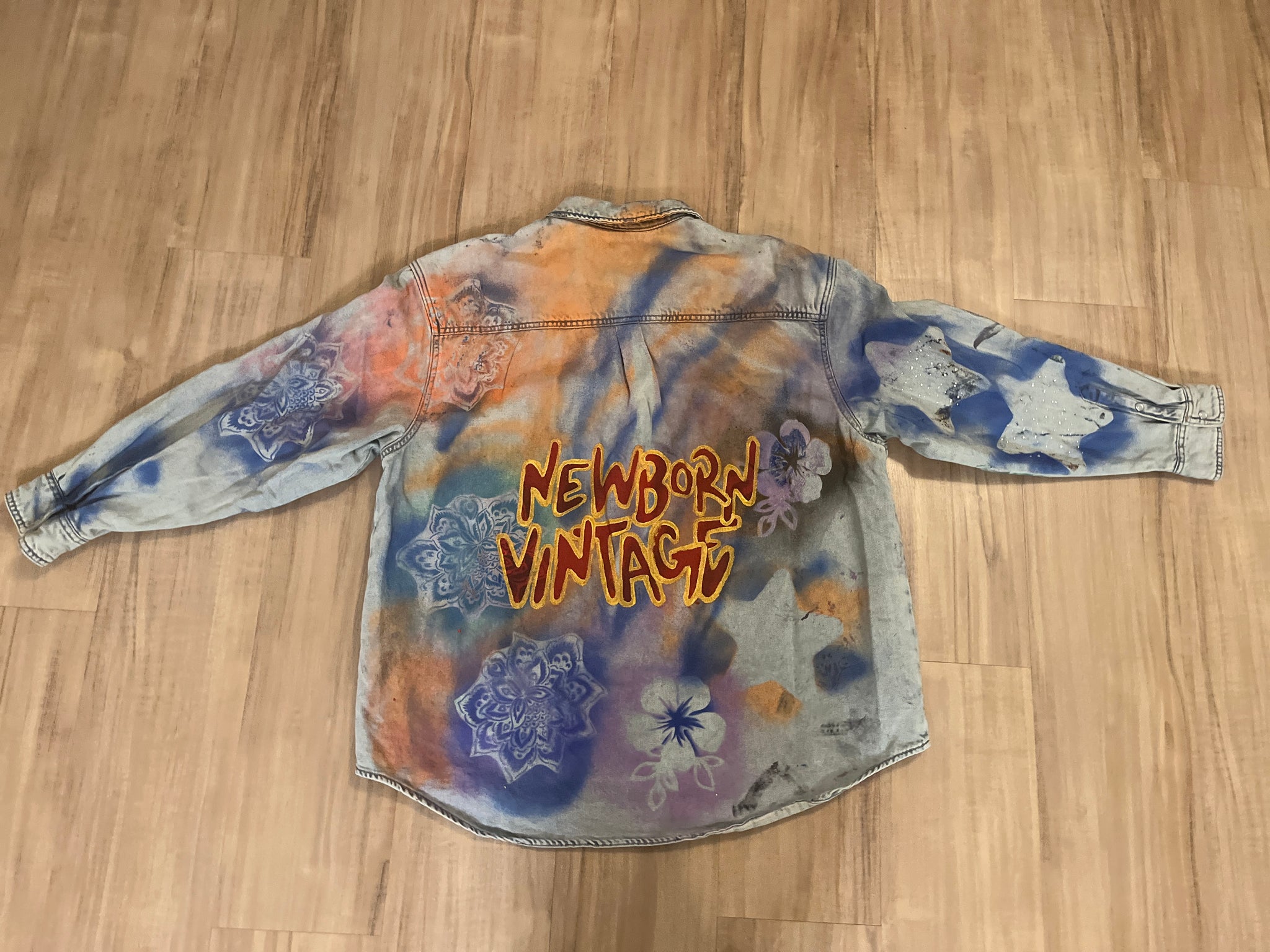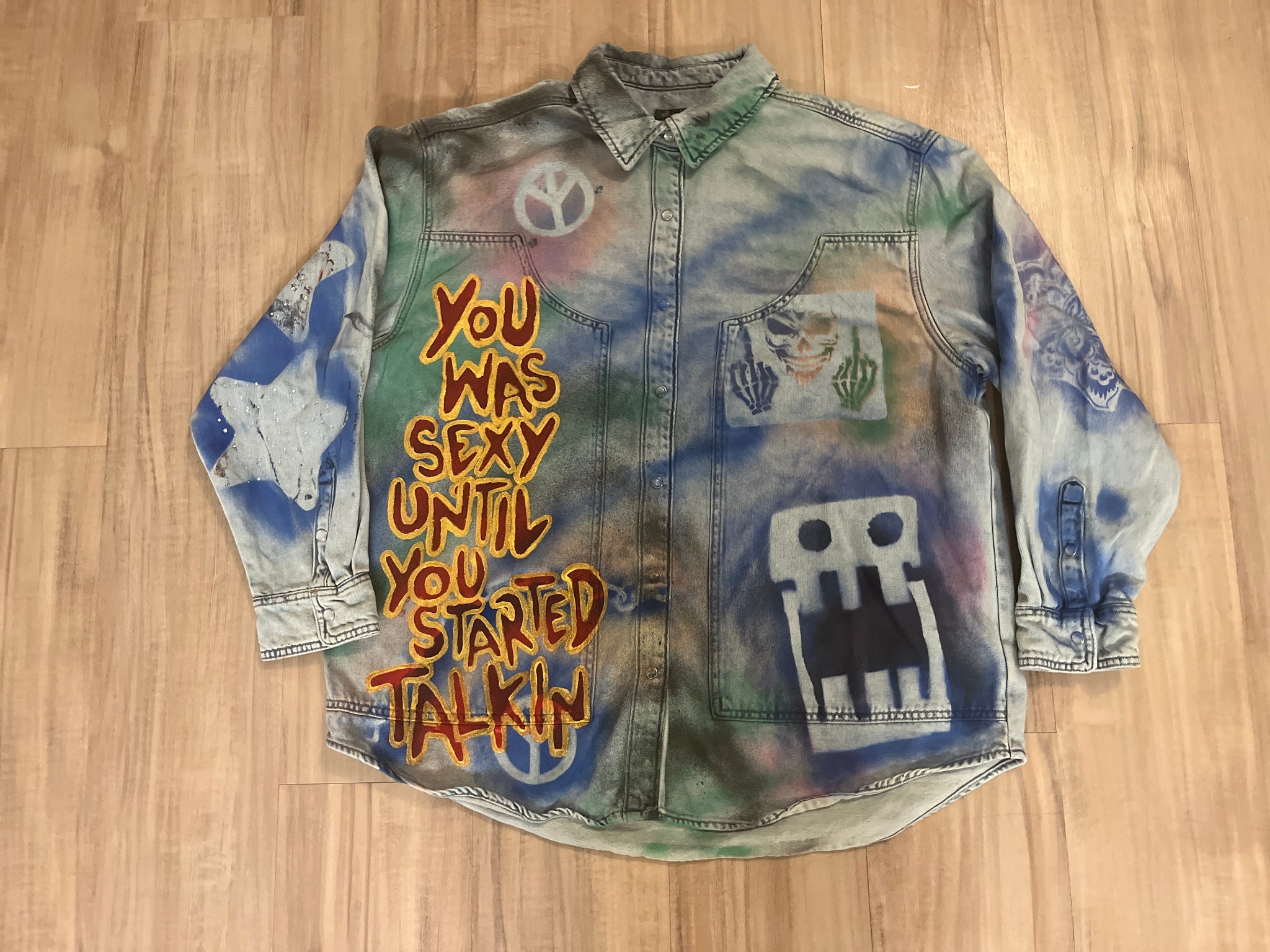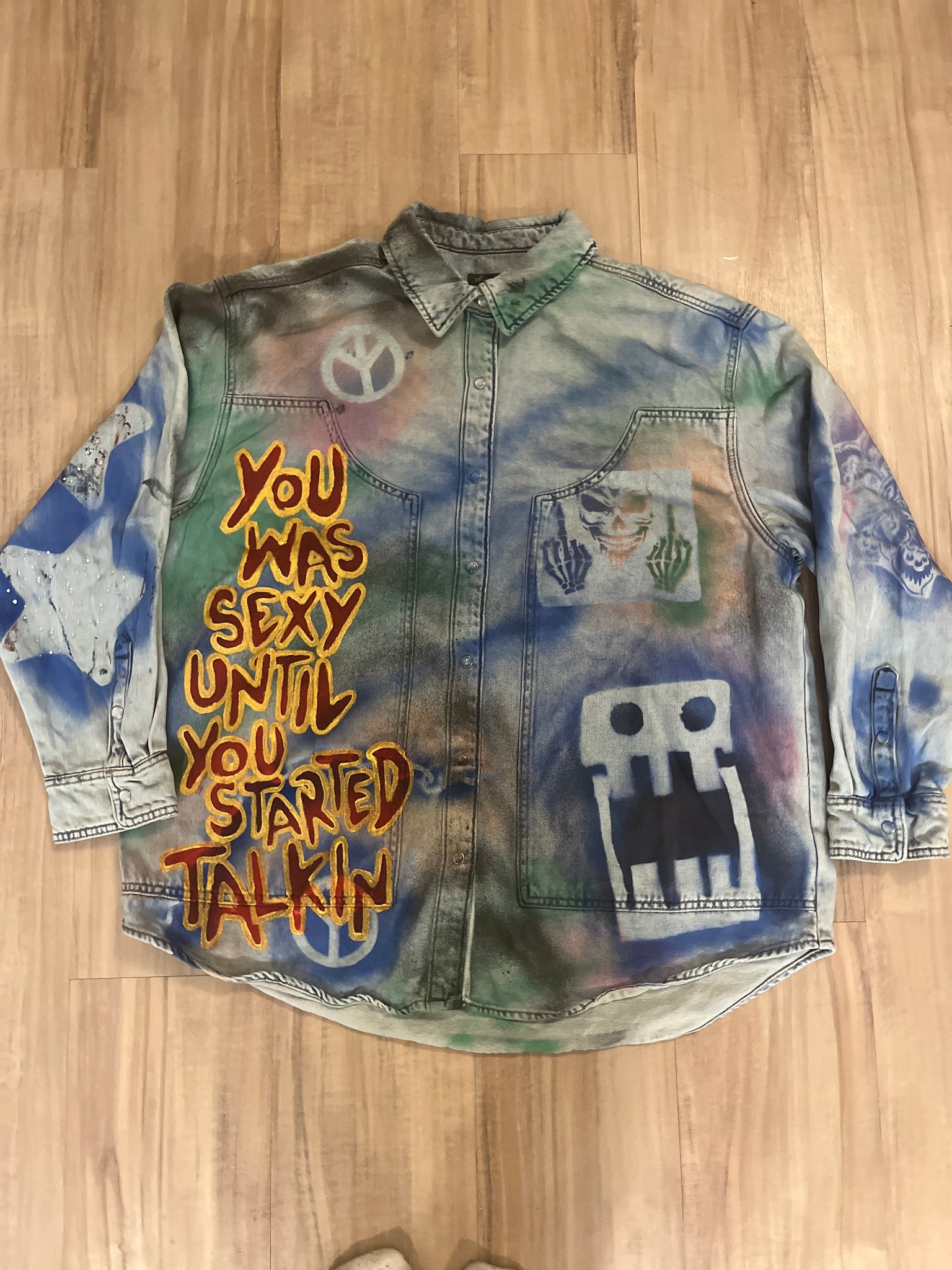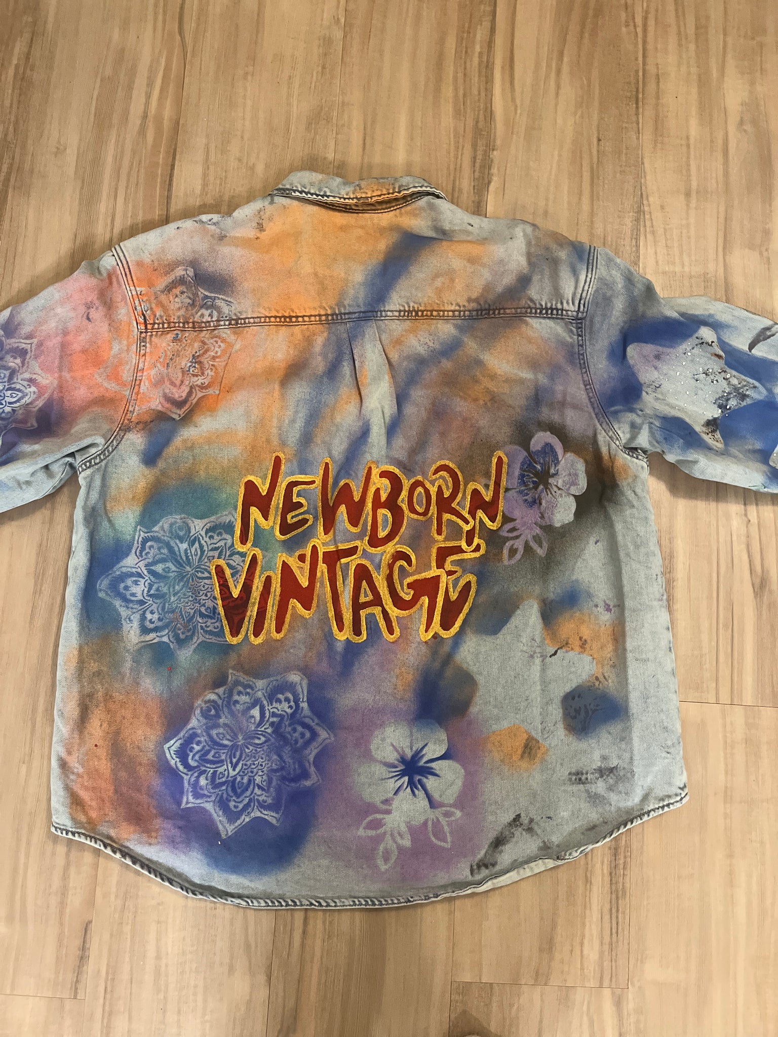 This extra large button up is hand painted, spray painted and has rhinestones added